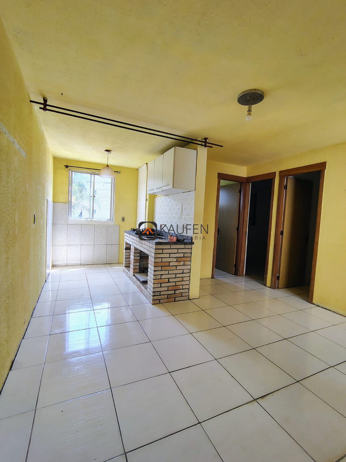 O apartamento conta com: 2 dormitórios, banheiro, sala de estar, lavanderia e cozinha integradas e garagem para 1 carro.