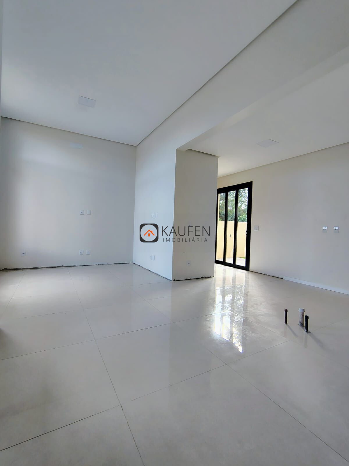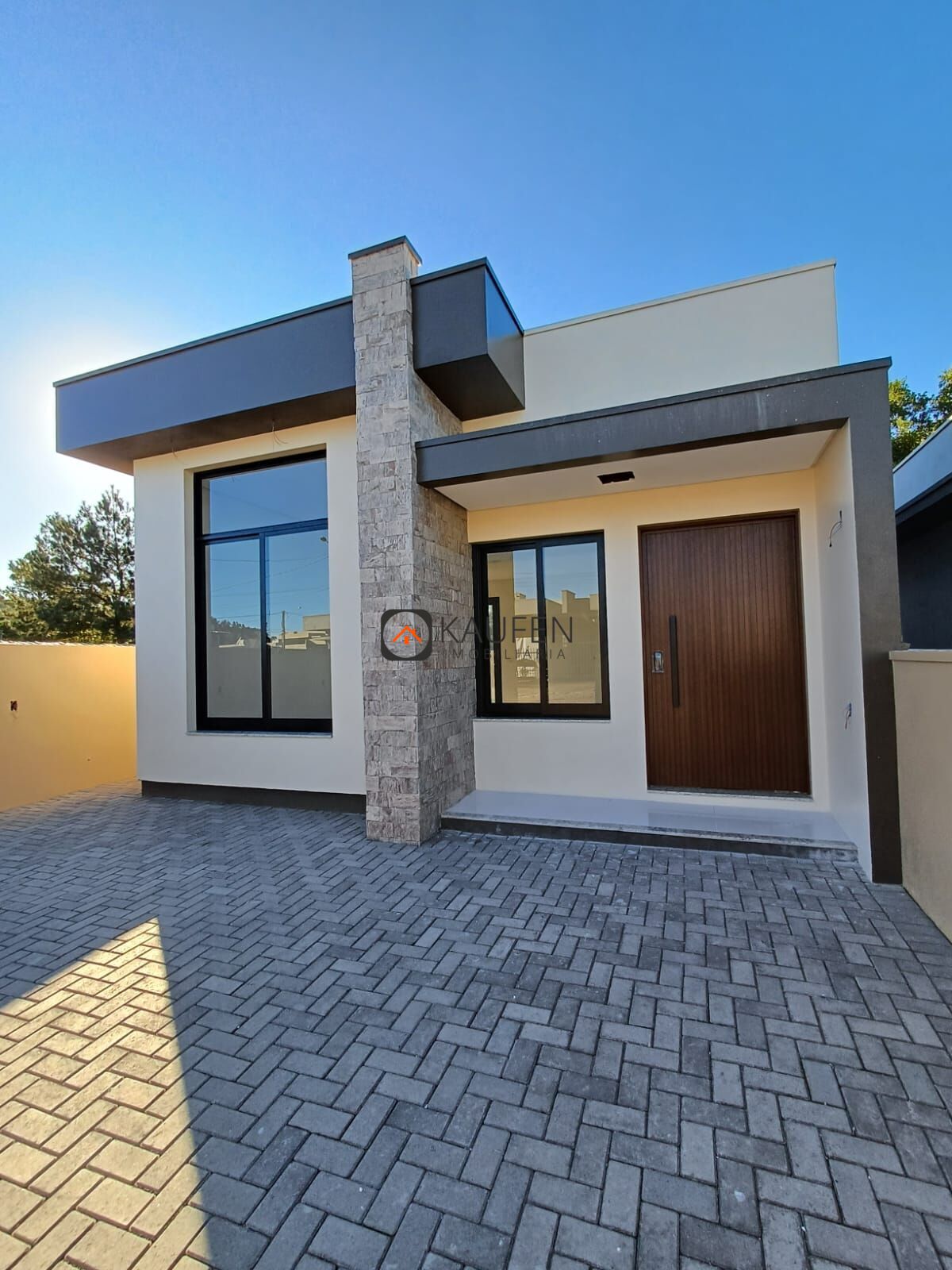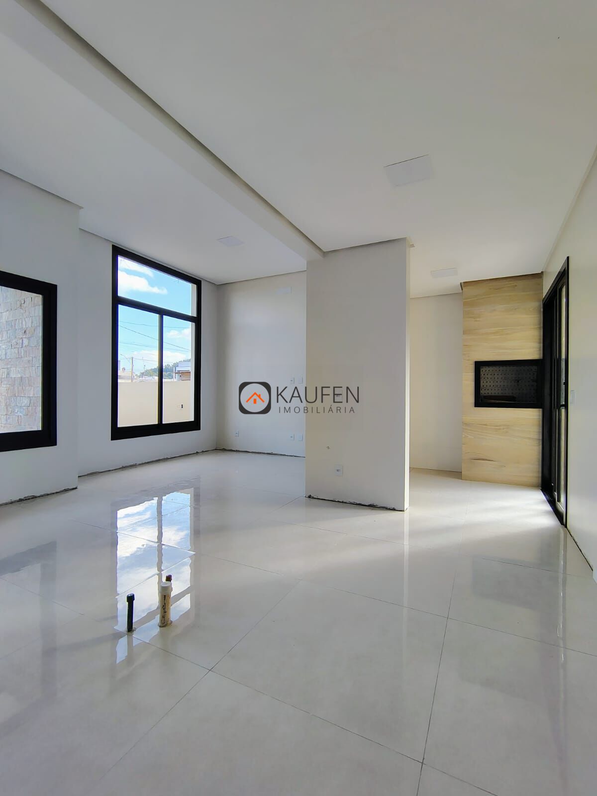 Imóvel composto por: 3 dormitórios (sendo 1 suíte), 2 banheiros, sala de estar, jantar e cozinha integradas, área de serviços, churrasqueira, pé direito alto, laje de concreto, teto rebaixado em gesso, espera para ar condicionado, espera para água quente, gás encanado, luminárias instaladas, piso porcelanato, paredes internas com acabamento em cal fino, portas internas em melamina, porta da frente em alumínio com fechadura digital, porta externa área de serviços em vidro, janelas em alumínio, vaga para 2 carros, pátio fechado com muros, grades e portão.