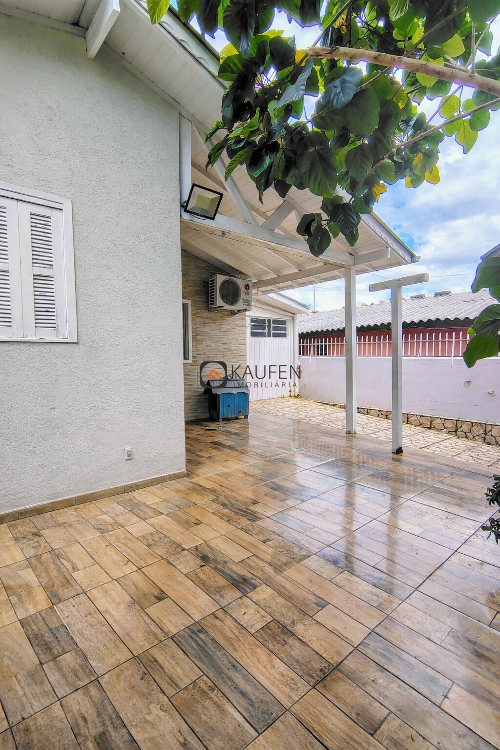 Características do imóvel: 2 dormitórios (sendo 1 suíte), 2 banheiros, sala de estar e jantar, cozinha, lavanderia, garagem coberta com churrasqueira e vaga para 1 carro, espaço para mais 1 carro no pátio, pátio fechado com muros, grades e portão.